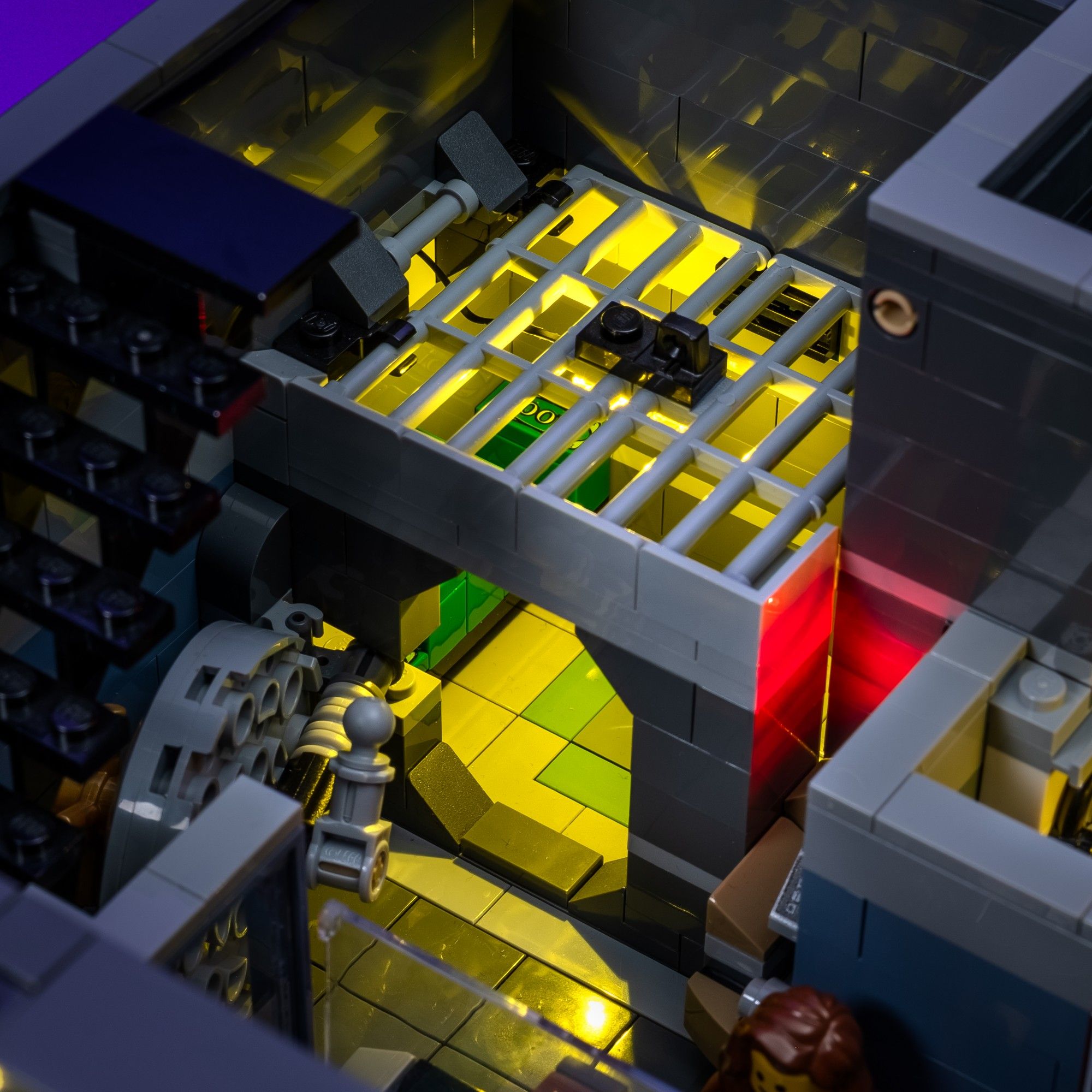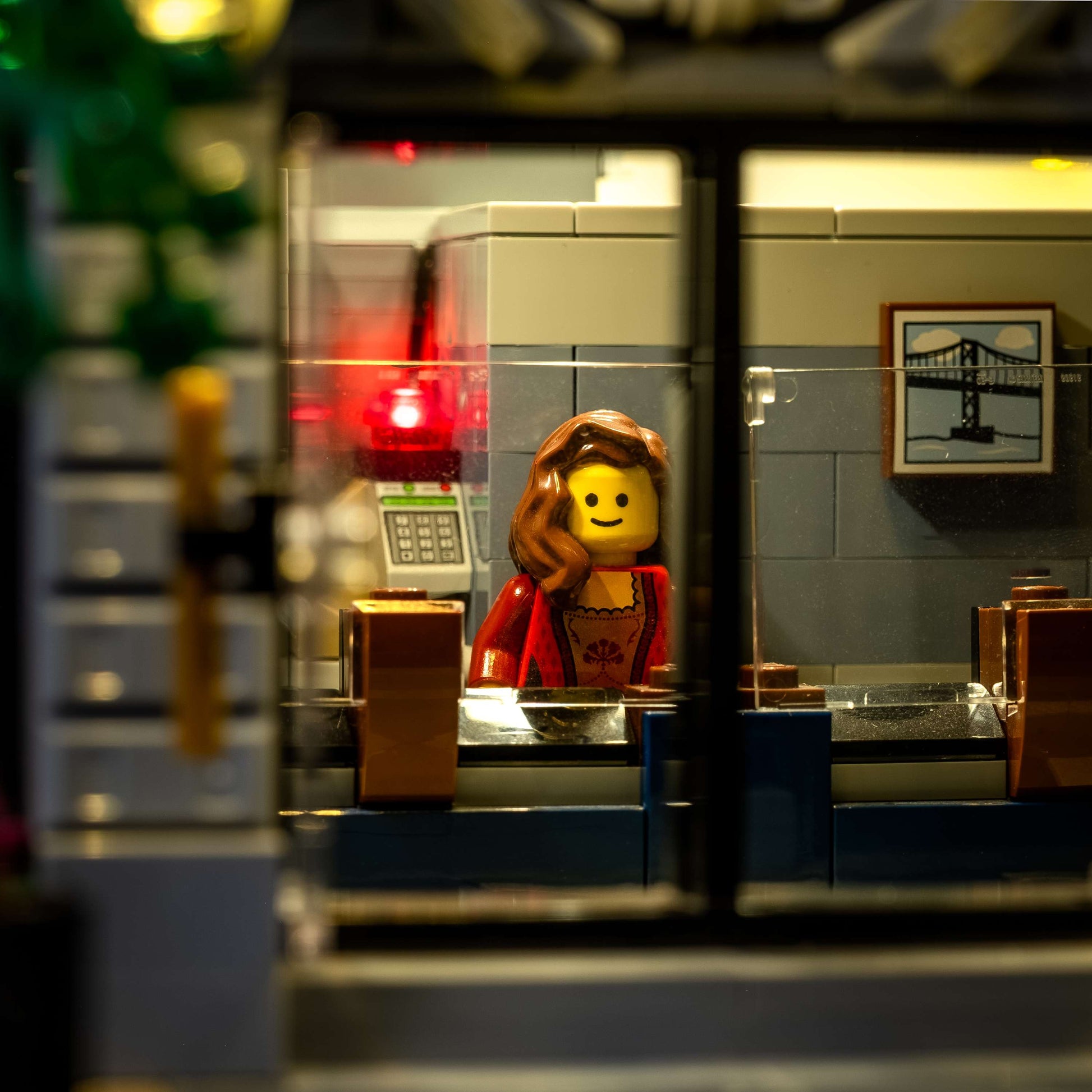 The yellow lamps light up the minifigures that are up late to finish some overdue work.