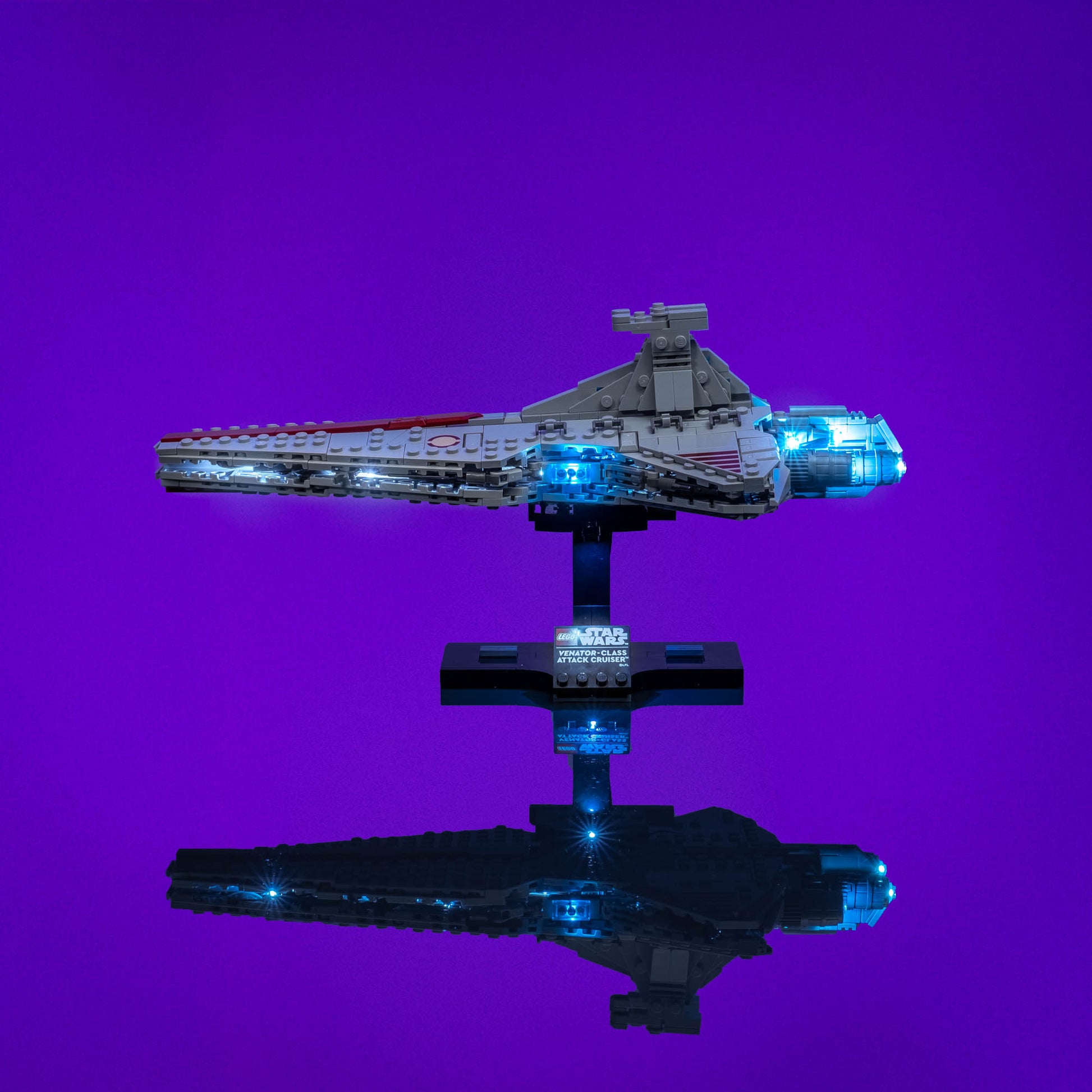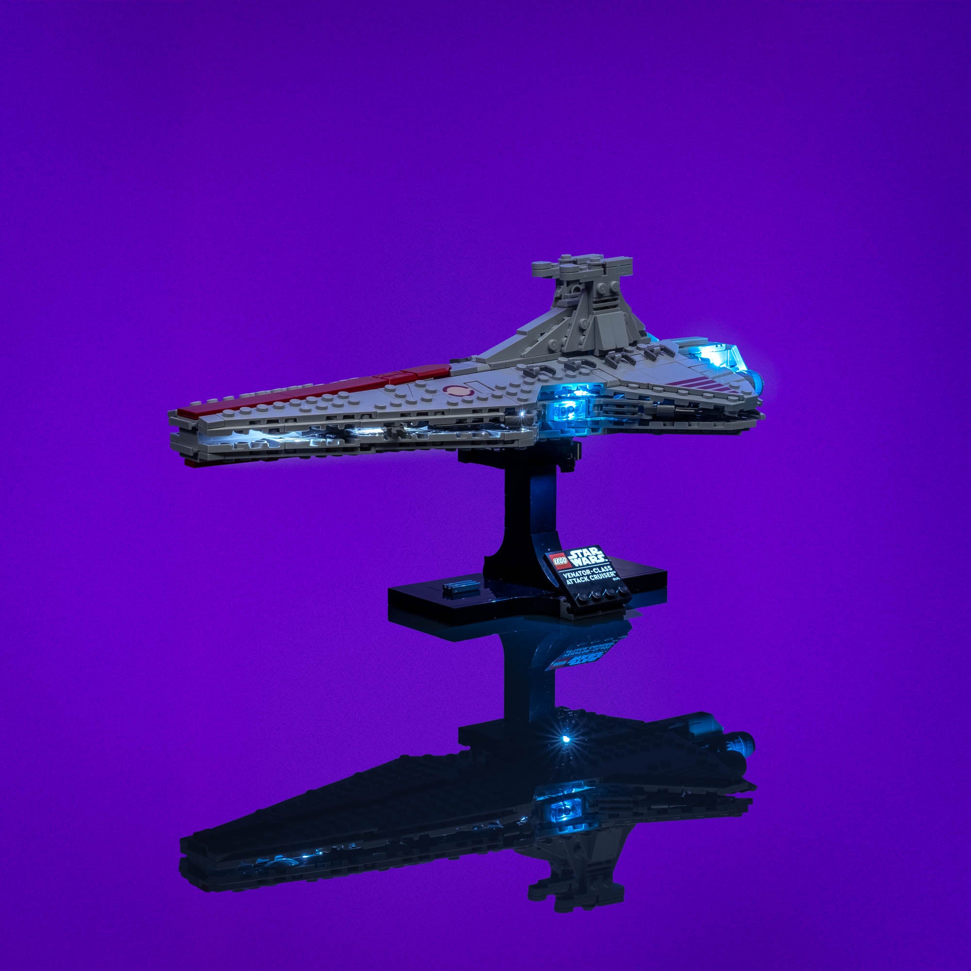 Illuminate the power of the Republic with a Light My Bricks™ Light Kit for the LEGO® Venator class Attack Cruiser 75441, designed with screen accuracy and UCS consistency in mind. Custom light blue engine string lights bring the massive boosters to life with minimal cabling, creating a clean, seamless glow that matches the Venator’s on screen appearance. Subtle light blue illumination enhances the shielded docking bays, while cool white internal lighting shines through the hull to replicate the cruiser’s window lines. Finished with a crisp spotlight on the display plaque, this light kit transforms the Venator into a striking centrepiece worthy of any Star Wars collection.