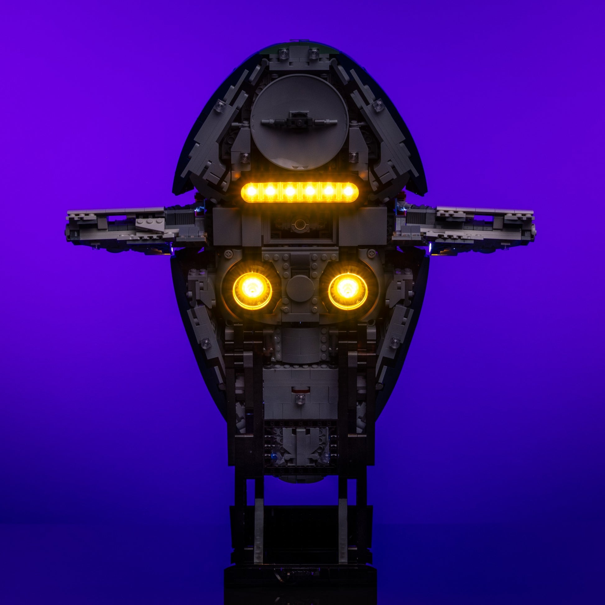 The cockpit features Astro Regular Cool White lights tucked away to illuminate the dark interior subtly, while an Astro Micro Red light beneath a trans-red plate recreates the ship’s targeting sensor. A hidden Astro Regular Cool White spotlight behind the boarding ramp activates when opened, illuminating the ship’s base with dramatic flair. Two more Astro Regular Cool White lights shine down on the display plaque for a polished UCS-style presentation.